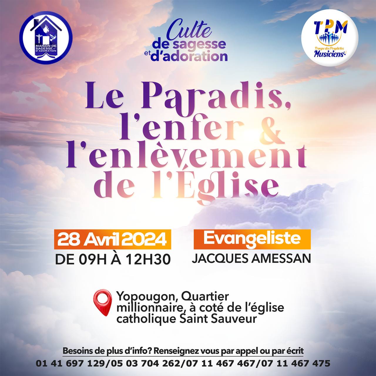 Vous êtes cordialement invités a prendre part à notre culte de Sagesse et d’Adoration qui aura lieu ce dimanche à partir de 09h00 dans les locaux de la Maison de Sagesse et d’Adoration. L’Evangéliste Jacques AMESSAN nous apportera la parole sur le thème : Le Paradis, l’Enfer et l’Enlèvement de l’Eglise.