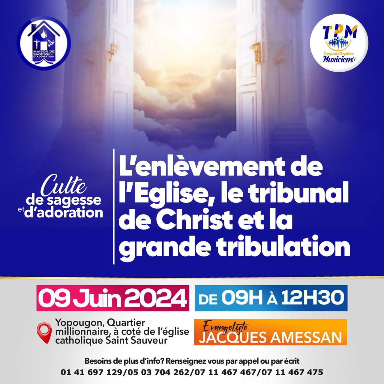 Vous êtes cordialement invités a prendre part à notre culte de Sagesse et d’Adoration qui aura lieu ce dimanche à partir de 09h00 dans les locaux de la Maison de Sagesse et d’Adoration. L’Evangéliste Jacques AMESSAN nous apportera la parole sur le thème : L’ Enlevement de l’Eglise, le tribunal de Christ et la grande tribulation .