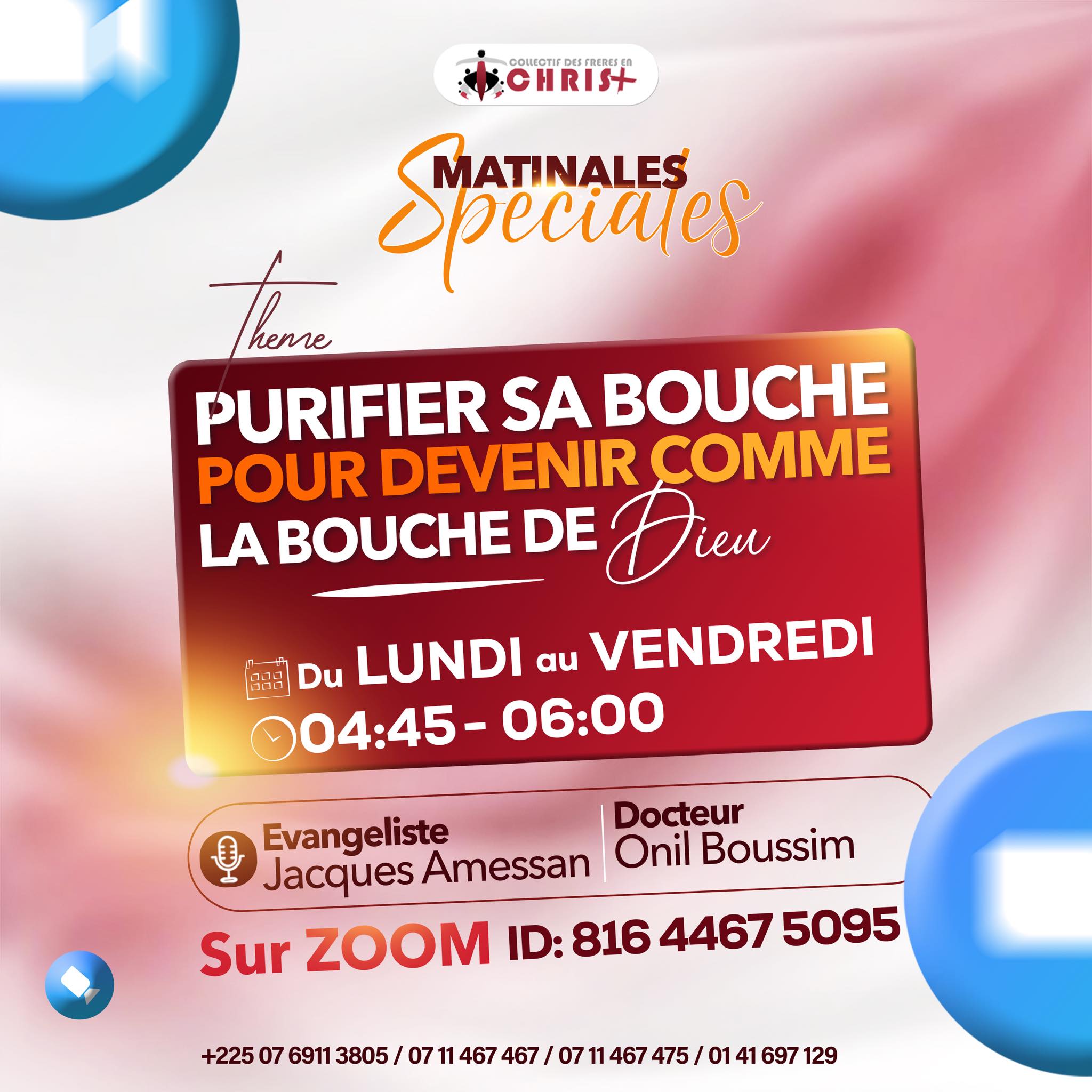 Cette semaine, l’Evangéliste Jacques AMESSAN et le Docteur Onil BOUSSIM nous apporteront la parole sur le thème: Purifier sa bouche pour devenir comme la Bouche de Dieu.