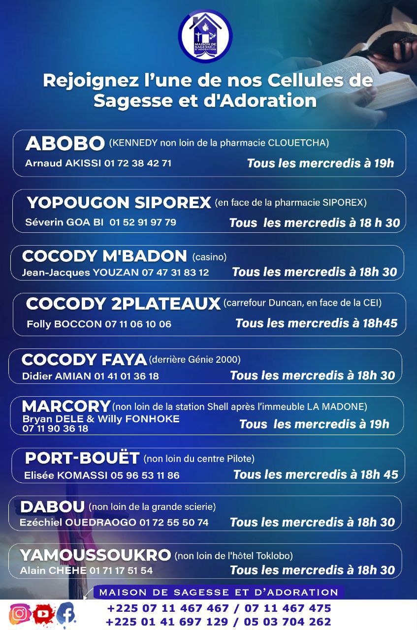 Rejoignez-nous tous les mercredis, en fonction de votre zone d’habitation, dans l’une de nos CELLULES DE SAGESSE ET D’ADORATION.