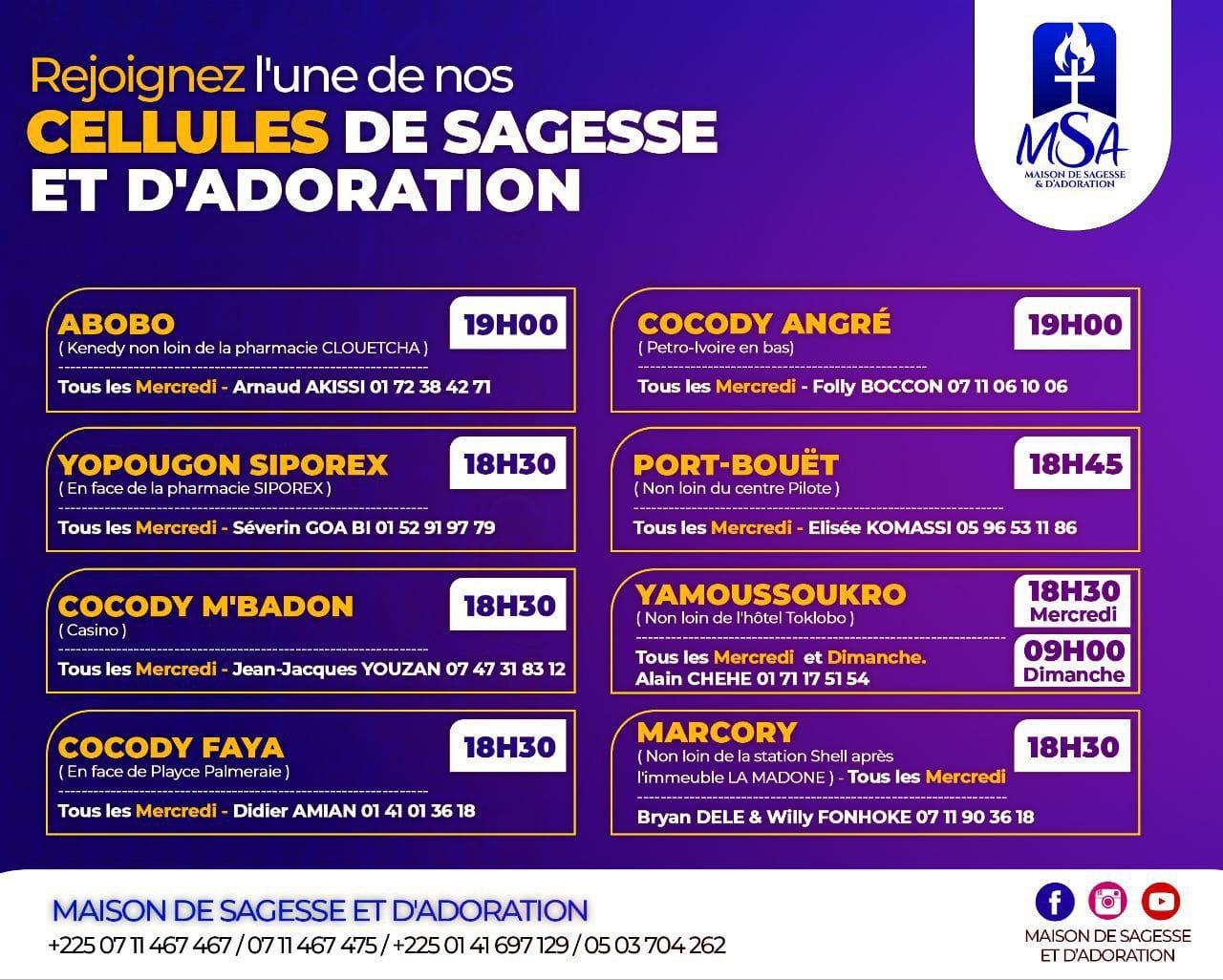 Rejoignez-nous tous les mercredis, en fonction de votre zone d’habitation, dans l’une de nos CELLULES DE SAGESSE ET D’ADORATION.