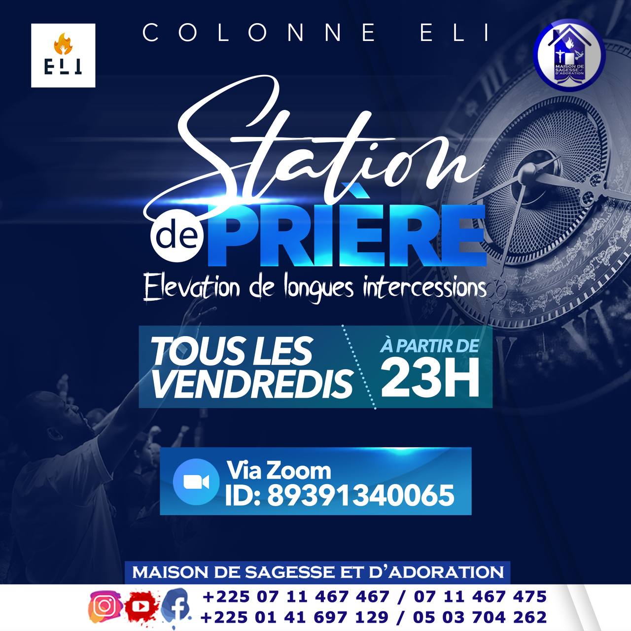 La Colonne ELI (Elévation des Longues prières et d’intercessions) à travers son département Gethsémané vous invite à prendre part au programme hebdomadaire dénommé « Station de Prières ». Ce moment prophétique de prières et d’intercessions est ouvert à tous ceux et celles qui désirent se ressourcer dans la prière.